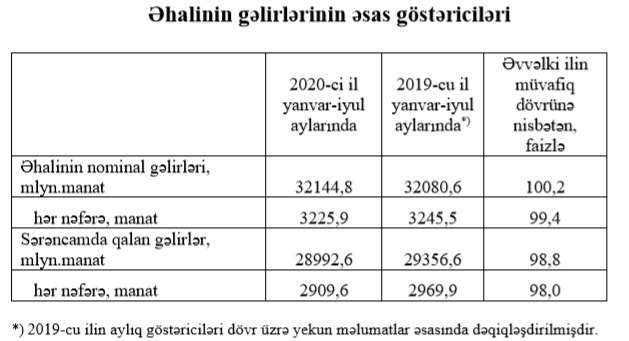 İlkin məlumatlara görə, 2020-ci ilin yanvar-iyul aylarında ölkə əhalisinin nominal gəlirləri 32 milyard 144,8 milyon manat təşkil etmiş və əvvəlki ilin eyni dövrünə nisbətən 0,2 faiz artmışdır.