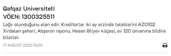Qafqaz Universiteti (VÖEN: 1300325511) ləğv olunduğunu elan edib.