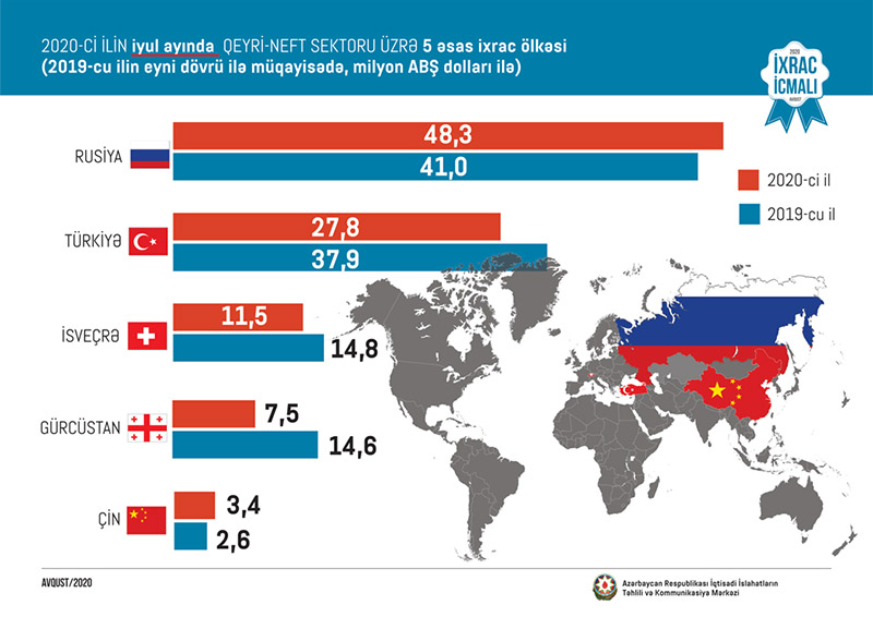 2019-cu ilin müvafiq dövrü ilə müqayisədə 2020-cu ilin 7 ayı ərzində Rusiyaya qeyri-neft ixracı 5,7 faiz, İsveçrəyə 21,9 faiz və Çinə 60,9 faiz artıb.