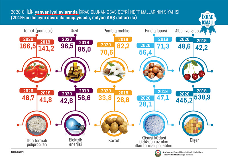 2020-ci ilin yanvar-iyul ayları ərzində ixrac edilən qeyri-neft sektoruna aid malların siyahısında isə pomidor (166,5 milyon ABŞ dolları) birinci, qızıl (sikkə kəsilməsində istifadə olunmayan, digər emal olunmamış formalarda – 96,5 milyon ABŞ dolları) ikinci və pambıq mahlıcı (70,6 milyon ABŞ dolları) üçüncü olub.