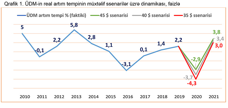 Azərbaycan Respublikasının İqtisadiyyat Nazirliyi tərəfindən hazırlanmış 3 ssenari üzrə (neftin qiyməti 35, 40, 45) proqnozlara əsasən 2020-ci ilin sonunda ÜDM-in azalması gözlənilir.