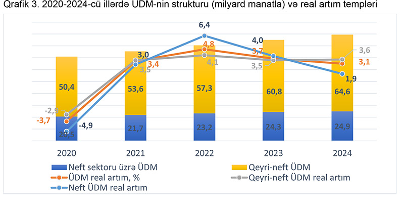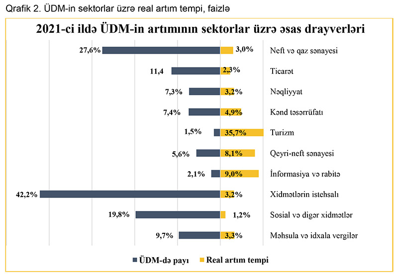 Proqnozlara əsasən 2021-ci il və ortamüddətli dövrdə iqtisadi artım templərinin nisbətən bərpa edilməsi ilə ölkədə ÜDM-in həcmi 2024-cü ildə 89,5 milyard manata qədər artacaqdır. Qeyd edək ki, qeyri-neft ÜDM növbəti ildə 3,5 faiz real artımla 53,6 milyard manat təşkil edəcəyi gözlənilir. 2021-ci ildə sahə strukturuna görə ümumi daxili məhsulun pay bölgüsündə ən böyük (33,2 faiz) çəkiyə malik sənayedə 25,0 milyard manatlıq, kənd təsərrüfatında 5,6 milyard manatlıq (xüsusi çəkisi 7,4 faiz), tikintidə 5,7 milyard manat, xidmətlərin istehsalında isə 31,8 milyard manat həcmində əlavə dəyər istehsal ediləcəyi gözlənilir. Məhsula və idxala xalis vergilər ÜDM-in strukturunda 9,7 faizə bərabər xüsusi çəkiyə malik olmaqla 7,3 milyard manat təşkil edəcəkdir. Sənayenin qeyri-neft sektorunda məhsul istehsalının 8,1 faiz artacağı proqnozlaşdırıldığı halda, neft sektorunda isə 3,0 faiz artım gözlənilir. Pandemiyadan zərər çəkmiş sahibkarlıq subyektlərinə dövlət dəstəyinin göstərilməsi, vergi güzəştləri və eləcə də güzəştli kreditlərə çıxış imkanlarının genişləndirilməsi, o cümlədən bu istiqamətdə planlaşdırılan tədbirlərin reallaşdırılması və real sektorda iqtisadi aktivliyin yenidən əvvəlki səviyyədə bərpa edilməsi nəticəsində ortamüddətli dövr üzrə ən yüksək real artım turizm və informasiya-rabitə sektorları üzrə gözlənilir.