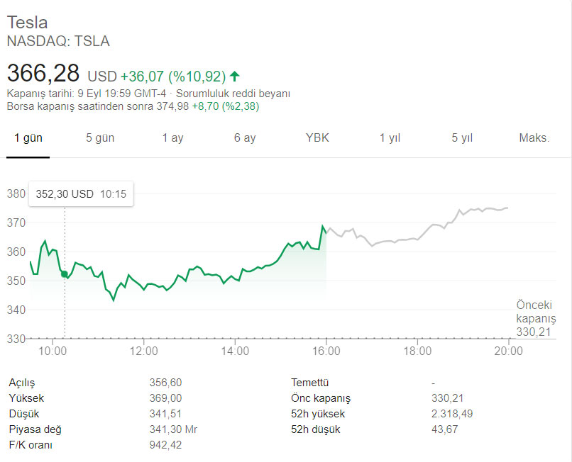 Dünən Tesla-nın səhmləri 366.28 dollardan bağlanıb.