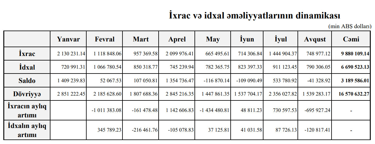 Dövlət Gömrük Komitəsinin aylıq hesabatına görə, bu ilin səkkiz ayında Azərbaycandan xarici ölkələrə 9 milyard 880 milyon 110 min dollar dəyərində məhsullar ixrac edib, idxalın həcmi isə 6 milyard 690 milyon 520 min dollar olub. Nəticədə, 3 milyard 189 milyon 590 min dollarlıq müsbət ticarət saldosu yaranıb.
