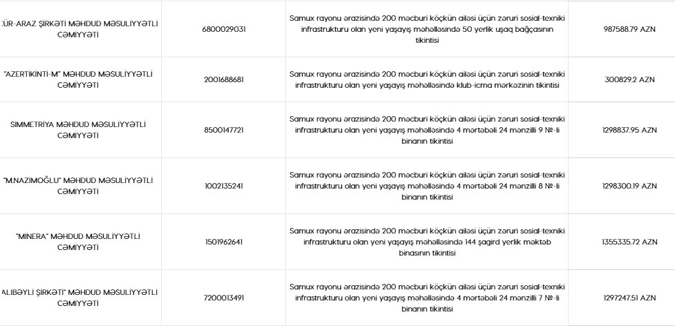 Marja xəbər verir ki, Məcburi Köçkünlərin Sosial İnkişafı Fondu binaların, uşaq bağçasının, məktəb və klub-icma mərkəzinin tikintisi üçün 11 şirkət ilə cəmi məbləği 13 milyon 310 min manat olan müqavilələr bağlayıb.