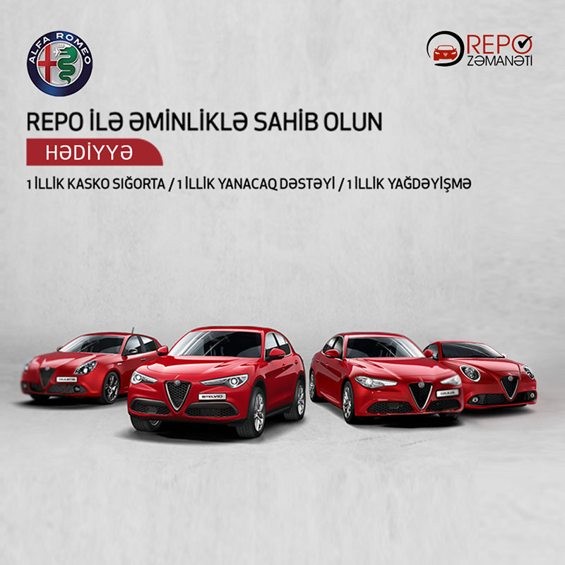 Kampaniyalardan biri Alfa Romeo markasına aid avtomobillərə şamil olunan REPO zəmanətidir. Bütün Alfa Romeo modelləri üçün REPO zəmanəti verməklə rəsmi nümayəndə “Avtolüks Azərbaycan” müştəriyə satdığı avtomobili 3 il ərzində satış qiymətinə azalan qalıq metodu ilə birinci il üçün 15%, sonrakı illərdə hər il üçün 10% aşağı olmaqla, barter (trade-in) vasitəsilə satın alacağını təsdiq edir. Şirkətin təklif etdiyi REPO şərtləri barəsində ətraflı məlumatı aşağıdakı linklərdən əldə etmək olar.
