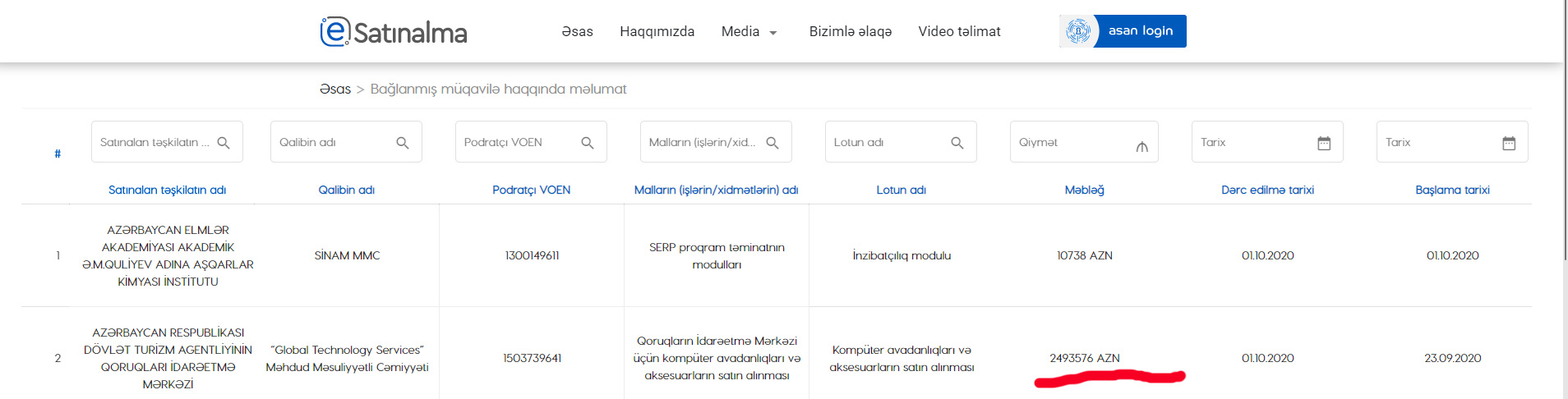 “Global Technology Services” MMC-nin Direktoru Rəşad Qafarzadə Marja-ya bildirdi ki, Portalda tenderin məbləği səhv göstərilib: "Biz qalib şirkət olaraq 24 min 935 manat məbləğində müqavilə imzalamışıq".
