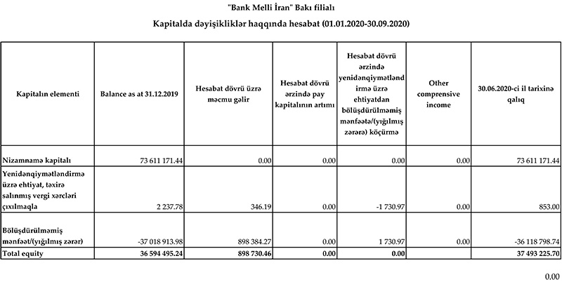 “Bank Melli İran" Bakı filialı 73 milyon 611 n 171 manat nizamnamə kapitalına malik olsa da 36 milyon 118 min 798 manat yığılmış zərərə görə 37 milyon 493 min 225 manat cəmi balans kapitalına malik olub.
