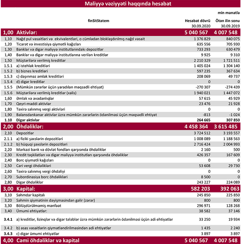 Kapital Bankın cəmi aktivləri 5 milyard manat səviyyəsini də aşaraq 30 Sentyabr 2020-ci il tarixində 5 milyard 40 milyon 567 min manata çatıb.