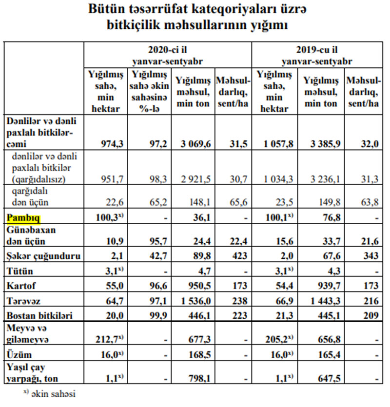 Oktyabr ayının 1-nә (2020-ci il yanvar-sentyabr) tarlalardan 36,1 min ton pambıq yığılıb.