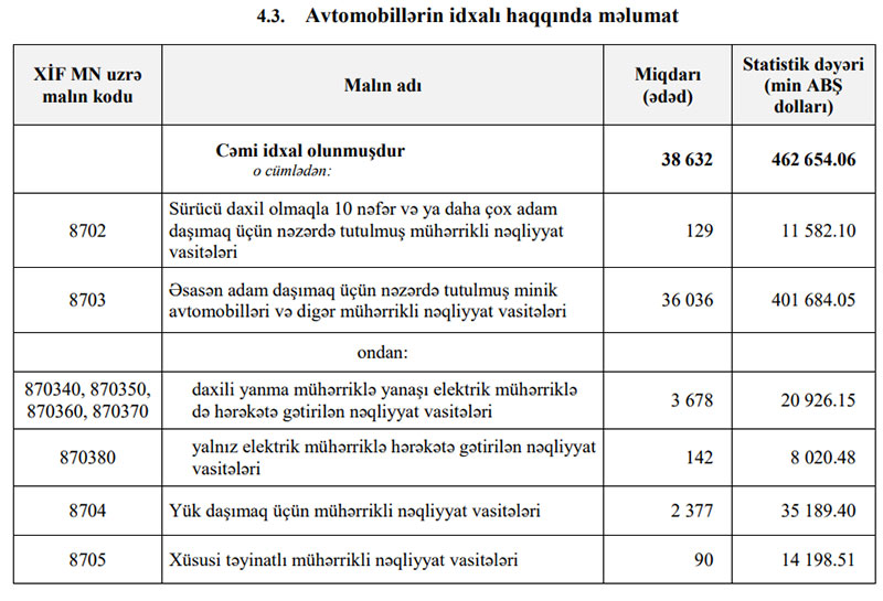 Cari ilin 9 ayında ayda ölkəmizə 36 min 36 ədəd minik avtomobili, 129 ədəd avtobus, 2 min 377 ədəd yük avtomobili və 90 ədəd xüsusi təyinatlı avtomobil idxal edilib.