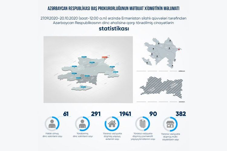 Baş Prokurorluğun mətbuat xidmətindən verilən məlumata görə, sentyabrın 27-dən hazırkı vaxtadək ermənilərin yaşayış məntəqələrini atəşə tutması nəticəsində 61 mülki şəxs həlak olub, 291 nəfər yaralanıb.