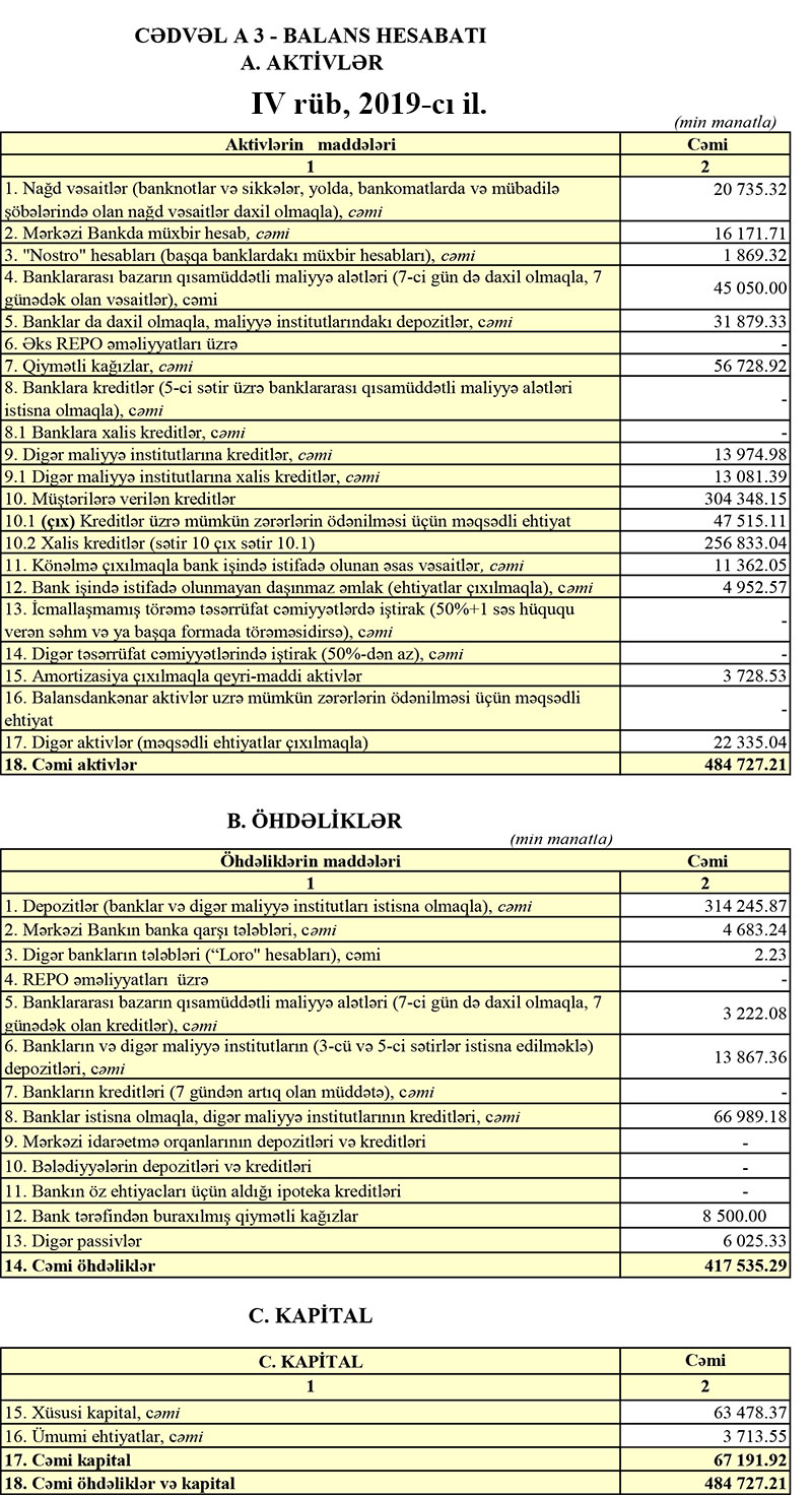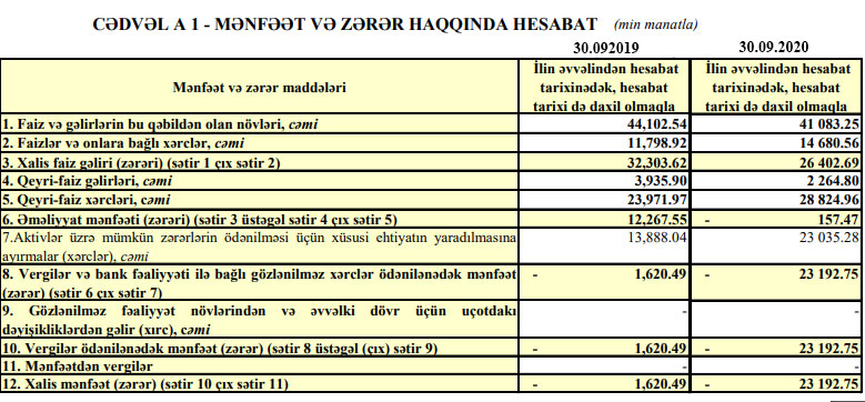 Xatırladaq ki, Yelo Bank 2018-ci ili 135 milyon 200 min manat zərər ilə başa vurmuş və yığılmış zərəri 285 milyon 440 min manata çatmışdı. Yığılmış zərər Bankın 348 milyon manat nizamnamə kapitalının böyük hissəsini silmişdi. Bank 2019-cu ili cəmi 69 min manat xalis mənfəət ilə başa vurmuşdu.