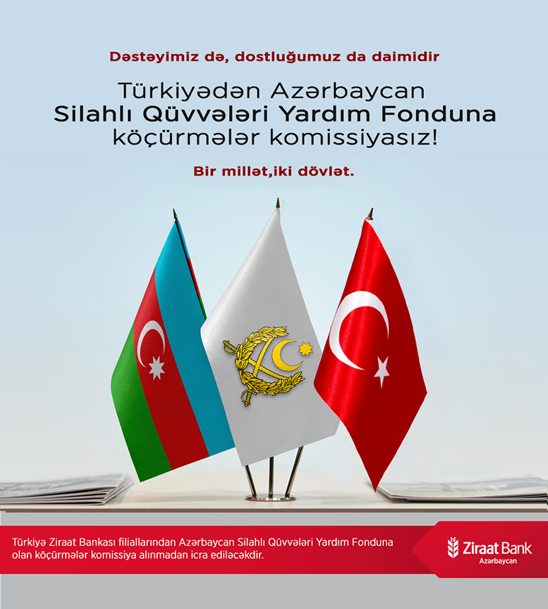 (®️) “Ziraat Bank Azərbaycan”nın təşəbbüsü ilə Türkiyədən Azərbaycan Respublikası Silahlı Qüvvələrinə Yardım Fonduna həm fiziki, həm də hüquqi şəxslər tərəfindən edilən bütün köçürmələr kommisiyasız olacaq.
