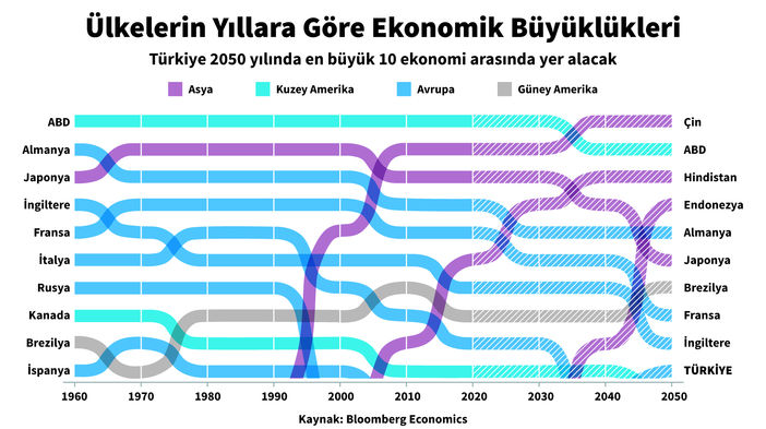 "Dünyanın ən böyük iqtisadiyyatlarından üçü Asiyadakı inkişaf edən bazarlardan olacaq" deyən iqtisadçılar, Türkiyə iqtisadiyyatının da 2050-ci ildə ən böyük onuncu iqtisadiyyat olmasını nəzərdə tuturlar.