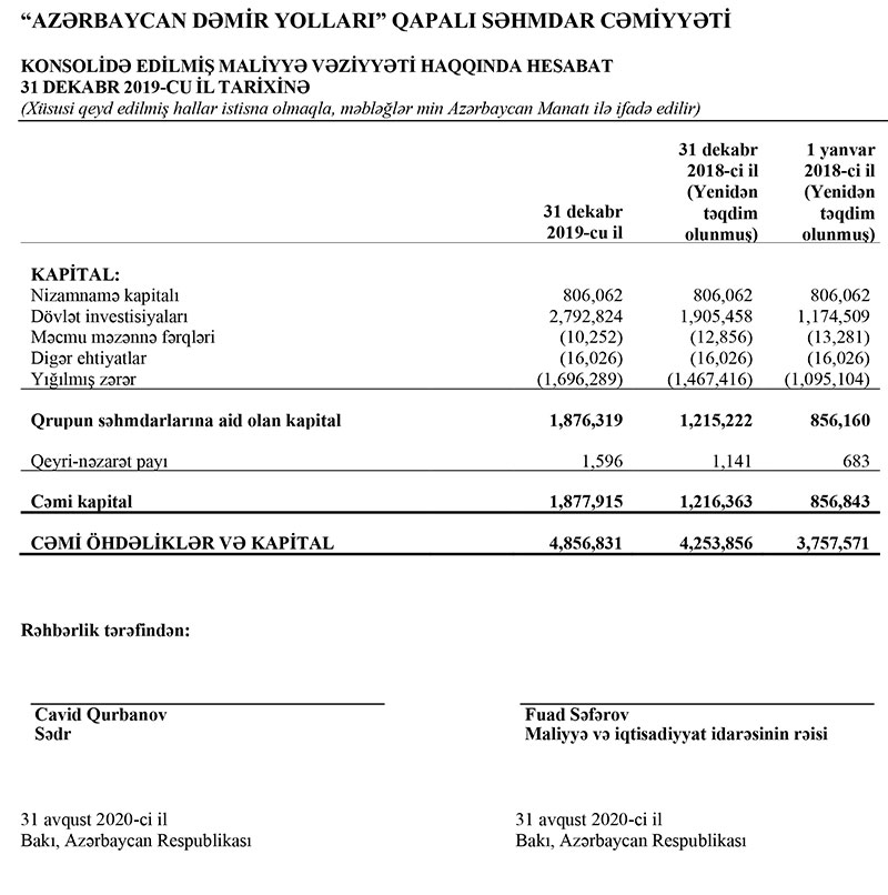“Azərbaycan Dəmir Yolları” QSC 2019-cu ili 228 milyon 418 min manat zərərlə başa vurub.