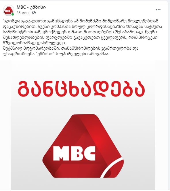 "Mövcud hadisə barədə bir açıqlama vermək istəyirik: şirkətimiz hər şeyi Daxili İşlər Nazirliyi ilə əlaqələndirdi, onların təlimatlarına uyğun hərəkət edirik. Prosesi dinc şəkildə başa çatdırmaq üçün əlimizdən gələni edəcəyik. Bu vəziyyətdə MBC-nin əsas vəzifəsi işçilərin sağlamlığı və təhlükəsizliyidir".