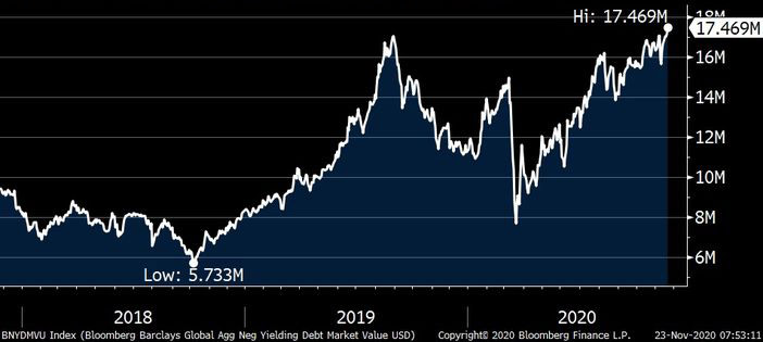 2019-cu ilin Avqust ayında 16 trilyon dollara çataraq rekord qıran mənfi faizli istiqrazlara tələb, pandemiya dövründə yenidən artmışdır.