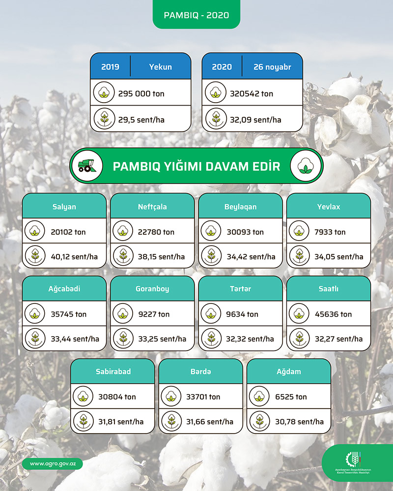 2020-ci ildə Azərbaycanın 21 rayonunda 100 min hektara yaxın sahədə pambıq əkilib. İndiyədək ən yüksək orta məhsuldarlıq Salyan (40,12 sent/ha), Neftçala (38,15 sent/ha), Beyləqan (34,42 sent/ha), Yevlax (34,05 sent/ha), Ağcabədi (33,44 sent/ha), Goranboy (33,25 sent/ha), Tərtər (32,32 sent/ha), Saatlı (32,27 sent/ha), Sabirabad (31,81 sent/ha), Bərdə (31,66 sent/ha) və Ağdam (30,78 sent/ha) rayonlarında qeydə alınıb. Daha iki rayonda - Zərdab (29,71 sent/ha) və Hacıqabulda (29,40 sent/ha) pambıq üzrə orta məhsuldarlıq göstəricisi 30 sentnerə yaxındır.