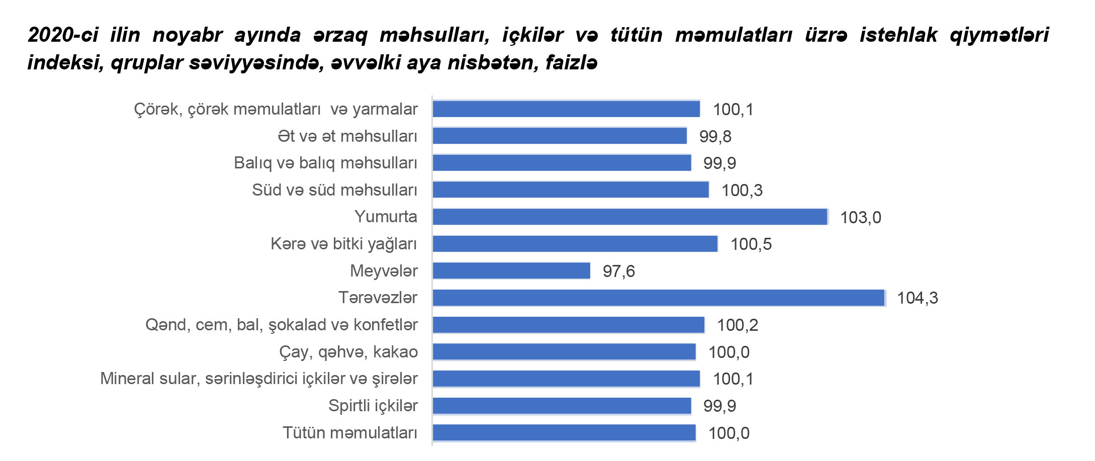 2020-ci ilin noyabr ayında ərzaq məhsulları, içkilər və tütün məmulatları üzrə istehlak qiymətləri indeksi əvvəlki aya nisbətən 0,4 faiz, əvvəlki ilin noyabr ayına nisbətən 3,9 faiz artıb.