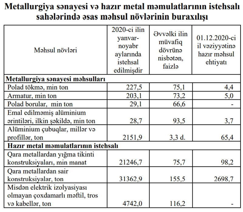 2020-ci ilin yanvar-noyabr aylarında 203,1 min ton armatur istehsal edilmişdir. İstehsal əvvəlki ilin müvafiq dövrünə nisbətən 26,8% azalıb.