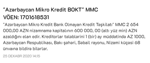 "Azərbaycan Mikro-Kredit" MMC bank olmayan kredit təşkilatı (BOKT) nizamnamə kapitalını 600 min manat və yaxud 22,6 % azaldaraq 2 milyon 654 min manatdan 2 milyon 604 min manata endirdiyini elan edib.
