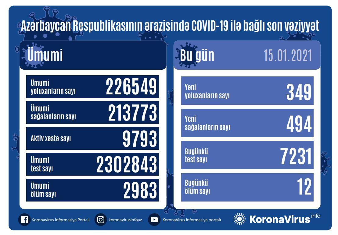 Azərbaycanda koronavirus (COVID-19) infeksiyasına 349 yeni yoluxma faktı qeydə alınıb, 494 nəfər müalicə olunaraq sağalıb və evə buraxılıb.
