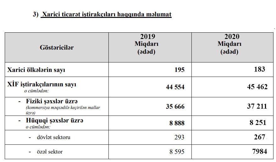 Marja Dövlət Gömrük Komitəsinin hesabatına istinadən xəbər verir ki, 2020-ci ildə xarici ticarət iştirakçısı olan hüquqi şəxslərin sayı 637 azalaraq 8251-ə düşüb. 2019-cu ildə 8888 hüquqi şəxs xarici ticarət iştirakçısı idi.