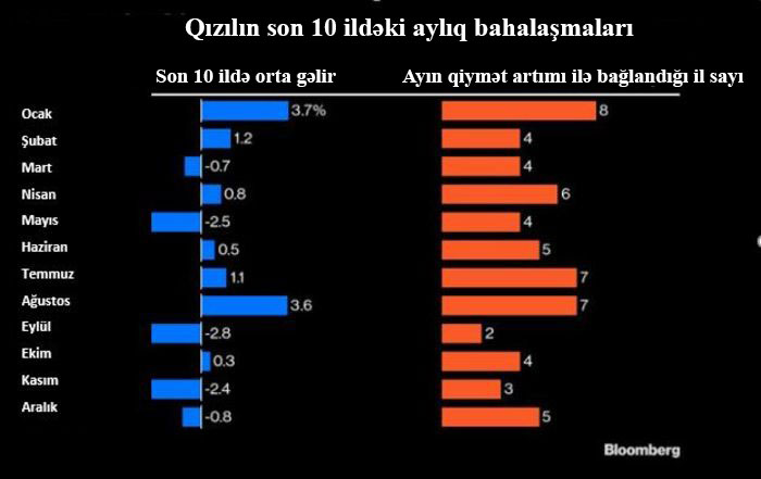 Çində yeni ay ili bayramı (21 yanvar - 20 Fevral) ərəfəsində ləl-cəvahirat, sikkə və külçə qızıl satışları artır, buna görə, Yanvar ayında qızıla tələb ümumiyyətlə yüksək olur. Qızıl, keçdiyimiz illərdəki 10 yanvar ayının 8-ində bahalaşıb və son 10 ildəki Yanvar aylarında orta hesabla 3,7% bahalaşıb.