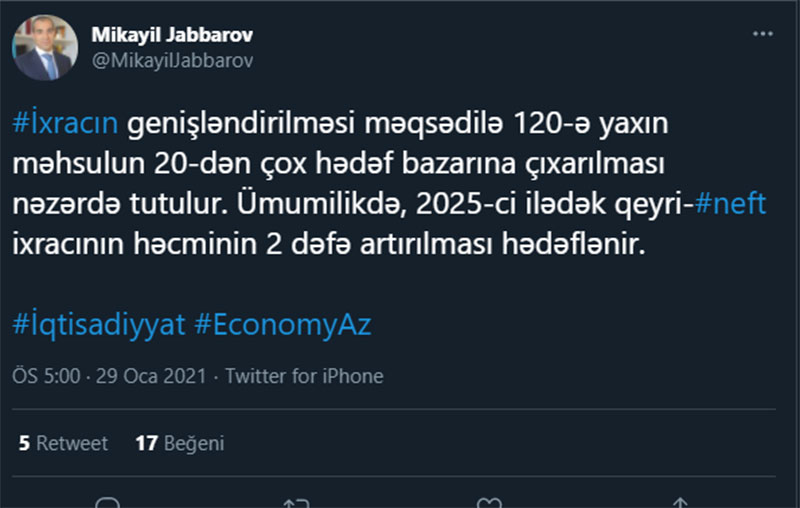 Bu barədə Azərbaycanın iqtisadiyyat naziri Mikayıl Cabbarov "Twitter" hesabında bildirib.
