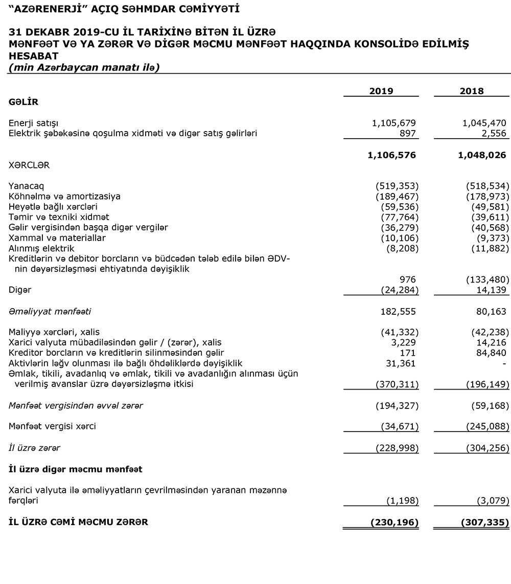 2019-cu ildə “Azərenerji”nin enerji satışından gəlirləri 1 milyard 105 milyon 679 min manat (2018-ci illə müqayisədə 5,8% çox), elektrik şəbəkəsinə qoşulma xidmətindən və digər satış gəlirləri 897 min manat (2,8 dəfə az), yanacaq xərcləri 519 milyon 353 min manat (0,2% çox), köhnəlmə və amortizasiya xərcləri 189 milyon 467 min manat (5,9% çox), heyətlə bağlı xərcləri 59 milyon 536 min manat (20,1% çox), təmir və texniki xidmət xərcləri 77 milyon 764 min manat (96,3% çox), xammal və materiallar üzrə xərcləri 10 milyon 106 min manat (7,8% çox), alınmış elektrik xərcləri 8 milyon 208 min manat (30,9% az), ƏDV-nin dəyərsizləşməsi ehtiyatında dəyişiklikdən gəlirləri 976 min manat (2018-ci ildə xərclər olub), maliyyə xərcləri 41 milyon 332 min manat (2,1% az), xarici valyuta mübadiləsindən gəlirləri 3 milyon 229 min manat (4,4 dəfə az), kreditor borcların və kreditlərin silinməsindən gəlirləri 171 min manat (496,1 dəfə az), aktivlərin ləğv olunması ilə bağlı öhdəliklərdə dəyişiklikdən gəlirləri 31 milyon 361 min manat (2018-ci ildə olmayıb), əmlak, tikili, avadanlıq və əmlak, tikili və avadanlığın alınması üçün verilmiş avanslar üzrə dəyərsizləşmə itkisi 370 milyon 311 min manat (88,8% çox), digər xərcləri 24 milyon 284 min manat (2018-ci ildə olmayıb), mənfəət vergisi ödəmələri 34 milyon 671 min manat (7,1 dəfə az), digər vergi ödəmələri isə 36 milyon 279 min manat (10,6% az) təşkil edib.