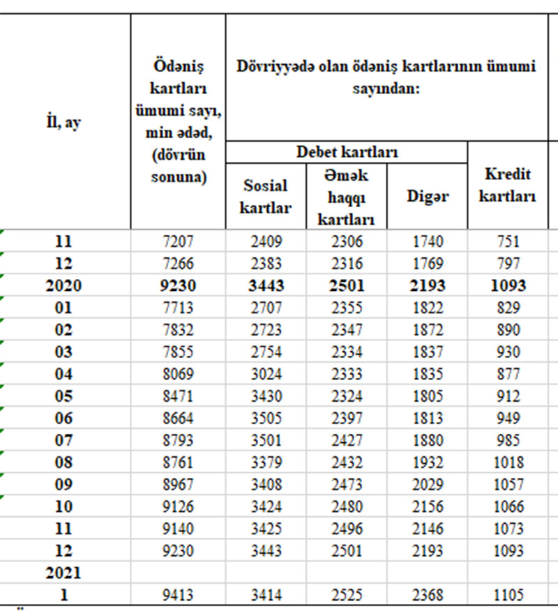Qeyd edək ki, 2020-ci il ərzində cəmi ödəniş kartlarının sayı 1 milyon 964 min ədəd artmışdı. 2019-cu ilin sonunda cəmi ödəniş kartlarının sayı 7 milyon 266 min ədəd təşkil etmişdi.