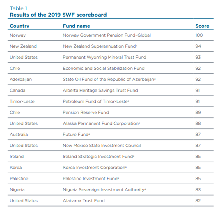 2019-cu il üzrə qiymətləndirmə cədvəli qlobal suveren fondların vəsaitlərinin idarə edilməsi, idarəçilik, dayanıqlılıq, şəffaflıq və hesabatlılıq, və eləcə də Santyaqo Prinsiplərinin tətbiqi kimi müxtəlif istiqamətlərin dəyərləndirilməsi əsasında formalaşmışdır. ARDNF 2019-cu il üçün qiymətləndirmədə hər bir kateqoriya üzrə demək olar ki, maksimuma yaxın bal toplamışdır.