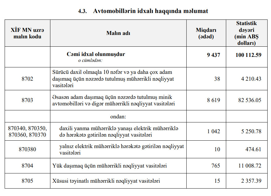 Xəbər verdiyimiz kimi, 2021-ci ilin yanvar ayında Azərbaycana 53 milyon 445 min dollar dəyərində 4 min 642 ədəd avtomobil idxal edilmişdir. Avtomobil idxalı 2020-ci ilin Yanvar ayı ilə müqayisədə 21,4% və ya 1264 ədəd azalmışdır.