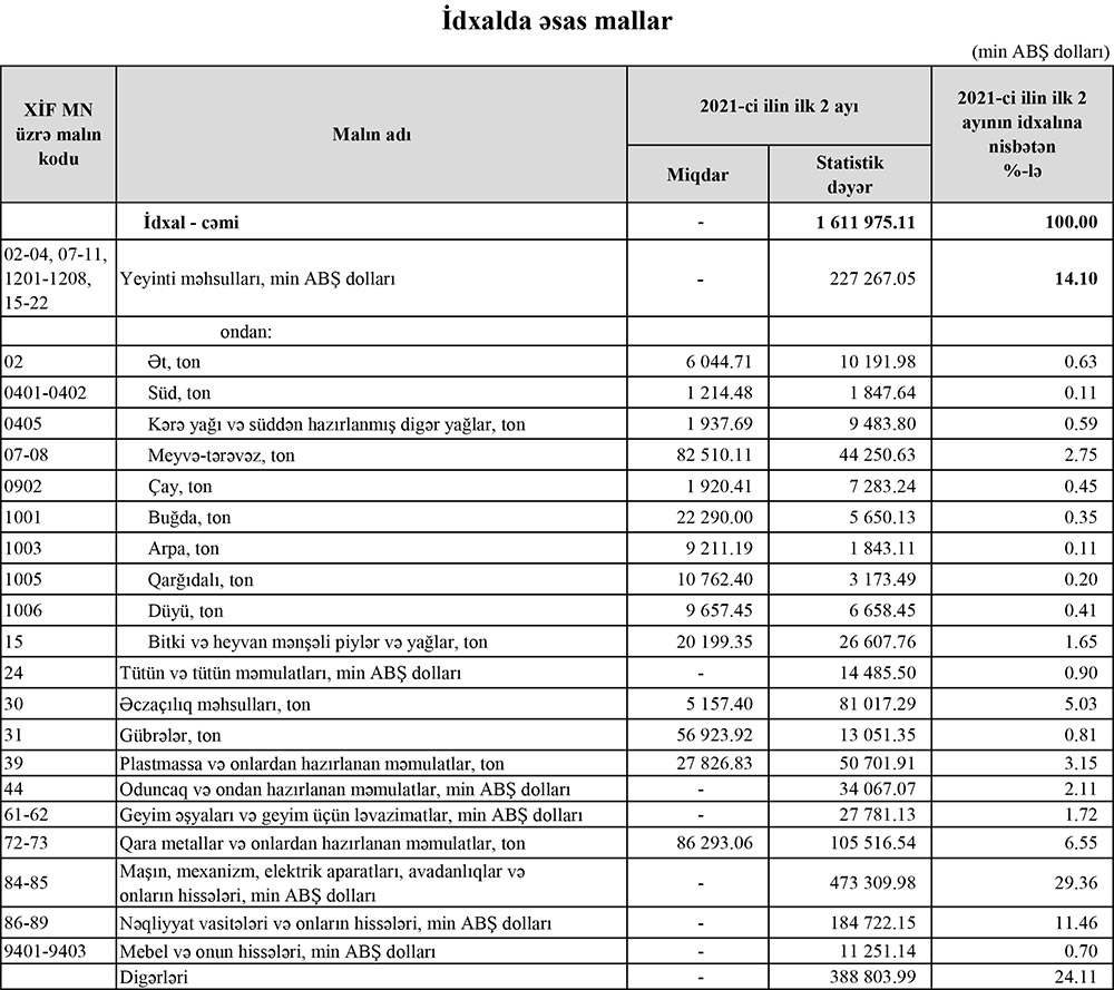 Ümumilikdə, yanvar-fevral aylarında qida məhsullarının ümumi ölkə idxalında çəkisi 14,1% təşkil edib.
