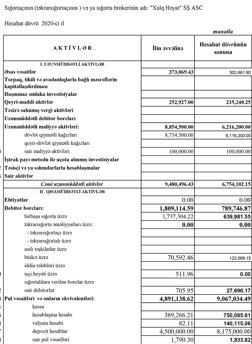 Marja xəbər verir ki, 2020-ci ildə "Xalq Həyat"nın cəmi əməliyyat gəlirləri 3 milyon 32 min manat, cəmi əməliyyat xərcləri 2 milyon 831 min manat, əməliyyat mənfəəti 201 min manat təşkil edib. Şirkət ötən il mənfəət vergisi ödəməyib.