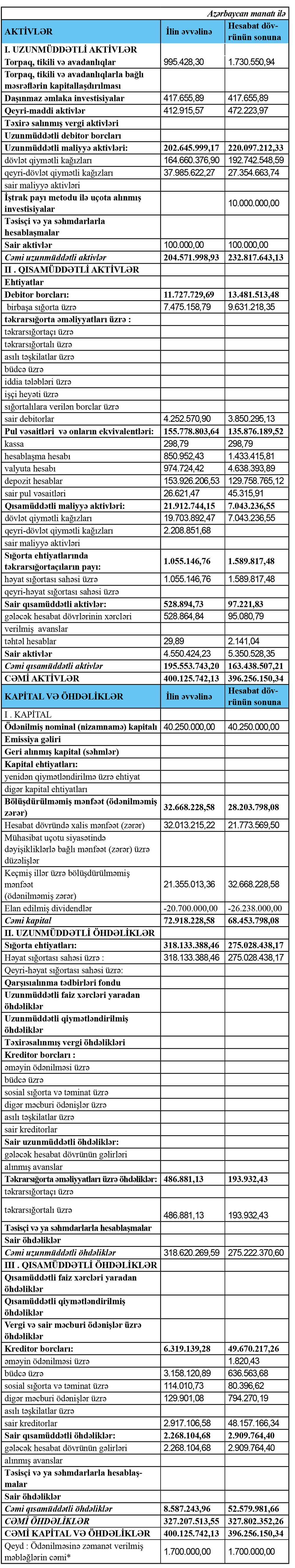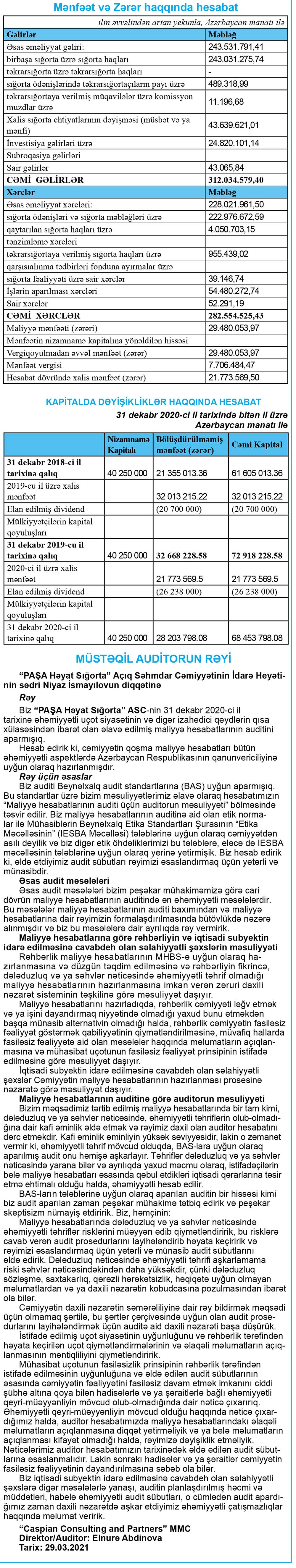 “PAŞA Həyat Sığorta” ASC-nin 2020-ci il dekabrın 31-nə olan maliyyə hesabatları