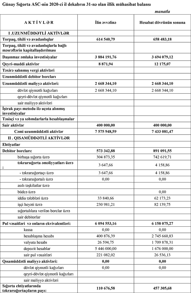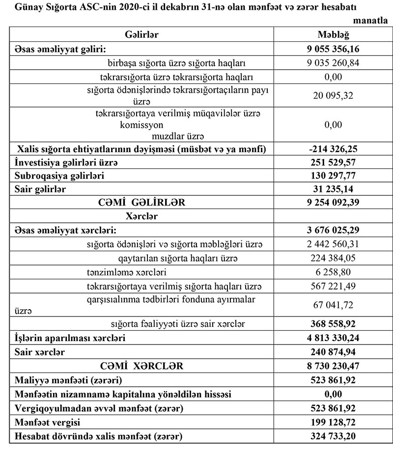 “Günay Sığorta” 2020-ni mənfəətlə başa vurub - MALİYYƏ GÖSTƏRİCİLƏRİ