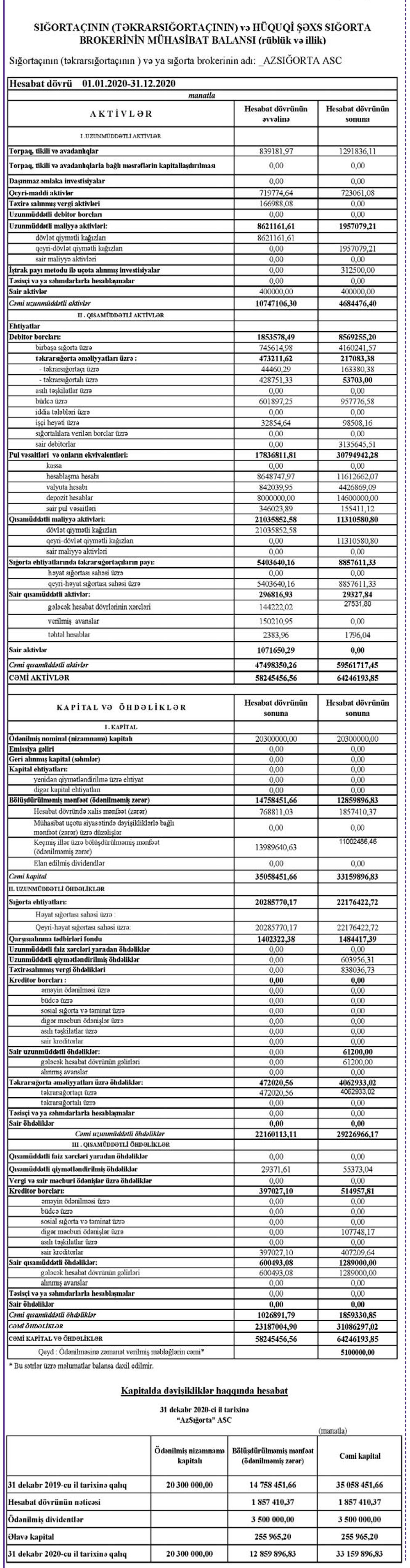 Bu il yanvarın 1-nə “Azsığorta”nın aktivləri 64 milyon 246 min manat olub ki, bu da 1 il əvvələ nisbətən 10,3% çoxdur. Hesabat dövründə şirkətin öhdəlikləri 34,1% artaraq 31 milyon 86 min manata çatıb, balans kapitalı isə 5,4% azalaraq 33 milyon 16 min manata düşüb.