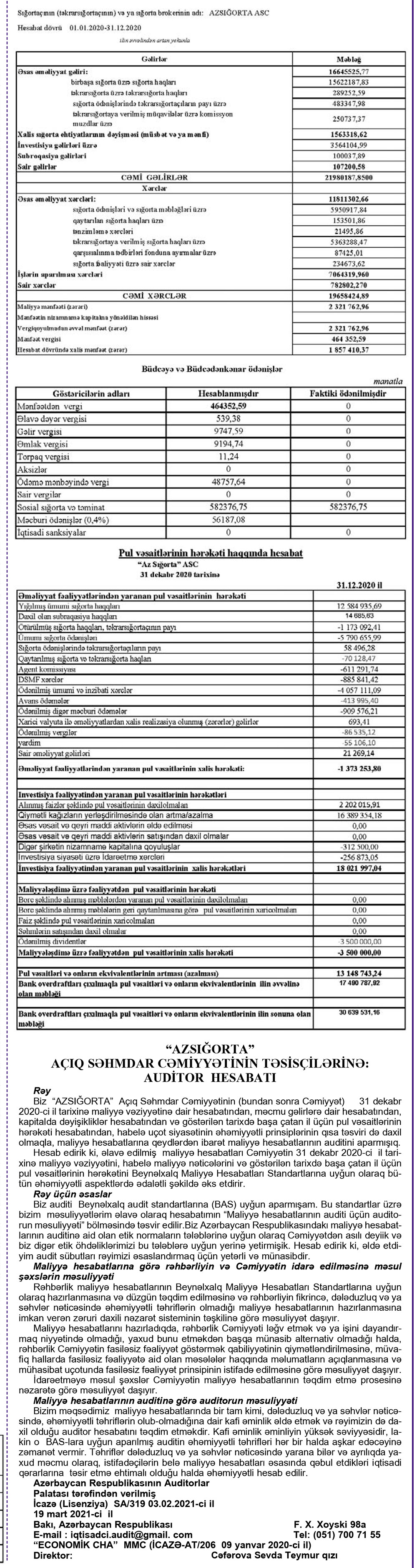 “Azsığorta” ASC 2020-ci ili 1 milyon 857 min manat xalis mənfəətlə başa vurub.