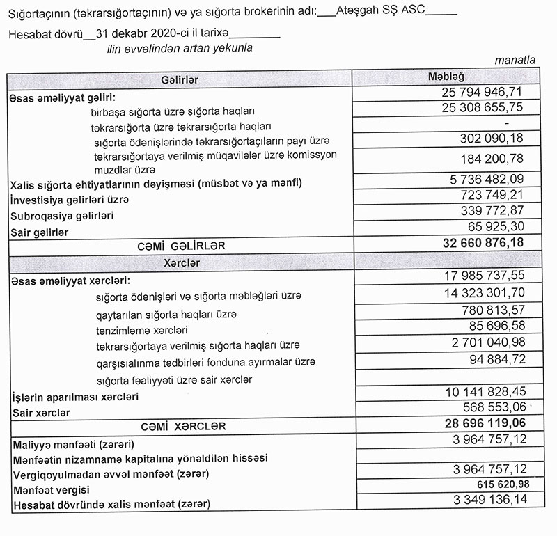 Marja şirkətin maliyyə heabatlarına istinadən xəbər verir ki, “Atəşgah” Sığorta Şirkətinin 2019-cu ildə 39 milyon 48 min manat təşkil etmiş cəmi gəlirləri 2020-ci ildə 32 milyon 661 min manata geriləyib (6 milyon 387 min manat və ya 16,3% azalıb). Şirkətin cəmi xərcləri isə 37 milyon 576 min manatdan 28 milyon 696 min manata düşüb (8 milyon 879 min manat və ya 23,6% azalıb).