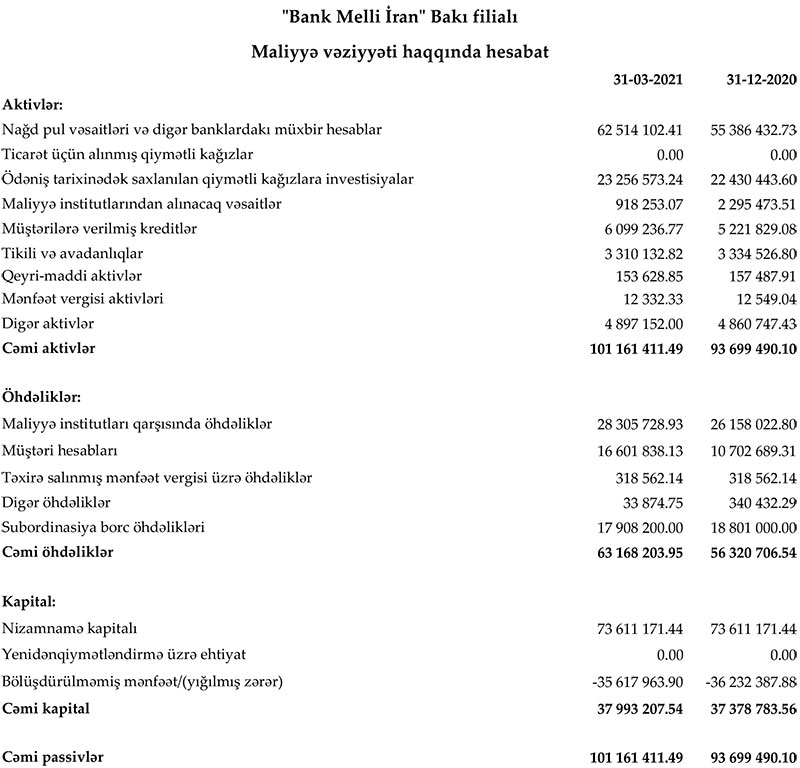 31 Mart 2021-ci il tarixində "Bank Melli İran" Bakı filialı 101 miylon 161 min manat cəmi aktivlərə, o cümlədən 6 milyon 99 min manat kredit portfelinə malik olub. Filial ötən ilin sonunda 93 milyon 699 min manat cəmi aktivlərə, o cümlədən 5 milyon 222 min manat kredit portfelinə malik idi.