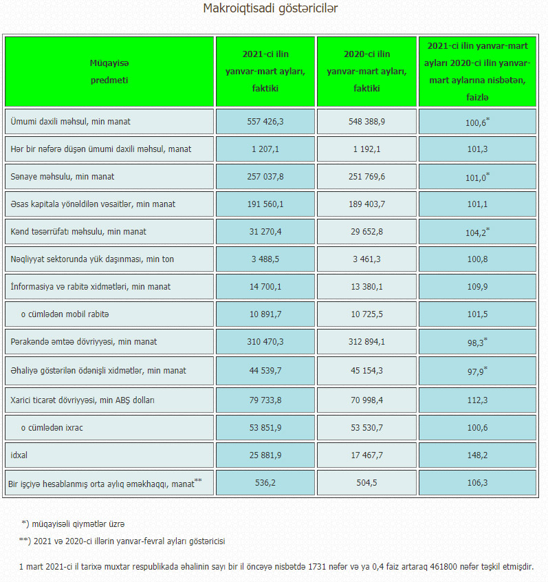 Bu ilin yanvar-mart aylarında Naxçıvan Muxtar Respublikasında ÜDM-in həcmi 2020-ci ilin eyni dövrünə nisbətən (müqayisəli qiymətlər üzrə) 0,6% artaraq 557 milyon 426,3 min manat təşkil edib.