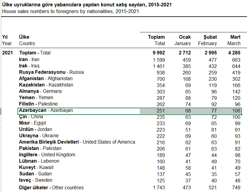2021-ci ilin yanvar-mart aylarında azərbaycanlılar Türkiyədə 251 mənzil alıblar. 2020-cu ilin eyni dövründə azərbaycanlılar Türkiyədə 284 mənzil almışdılar.