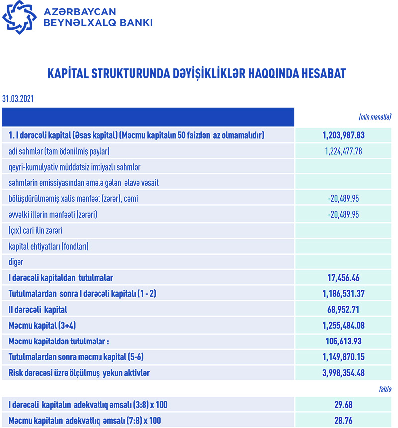 31 mart 2021-ci il tarixində “Azərbaycan Beynəlxalq Bankı” tutulmalardan sonra 1 milyard 149 milyon 870 min manat məcmu kapitala malik olub.