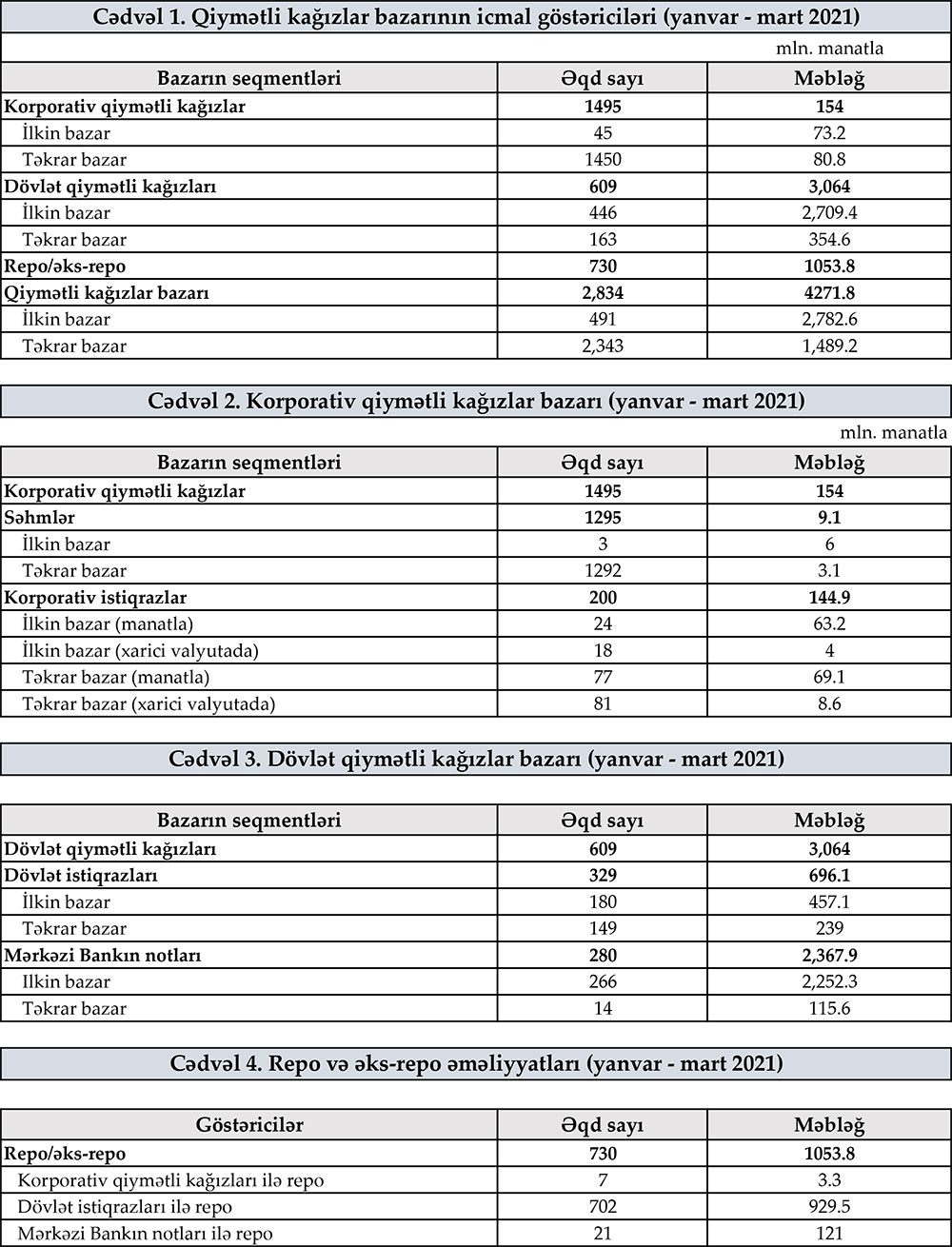 31 mart 2021-ci il tarixinə qiymətli kağızlar bazarının əsas göstəriciləri açıqlanıb.