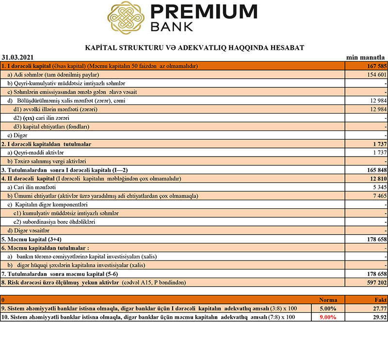 31 Mart 2021-ci il tarixində “Premium Bank” 178 milyon 658 min manat məcmu kapitala malik olub. Bank ötən ilin sonunda 173 milyon 917 min manat məcmu kapitala malik idi.