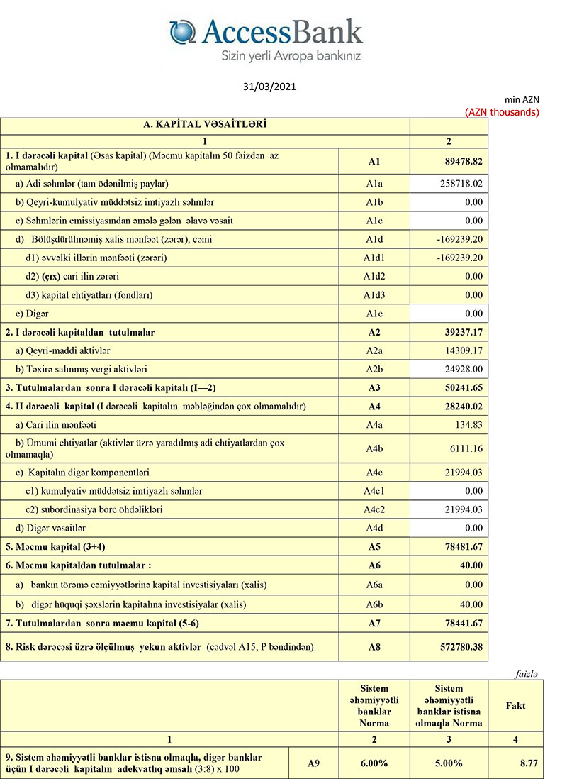 Hazırda Bankın cəmi məcmu kapitalı 78.4 milyon manat təşkil edir ki, bu da minimum məcmu kapital normasından (50 milyon manat) 28.4 milyon manat çoxdur.