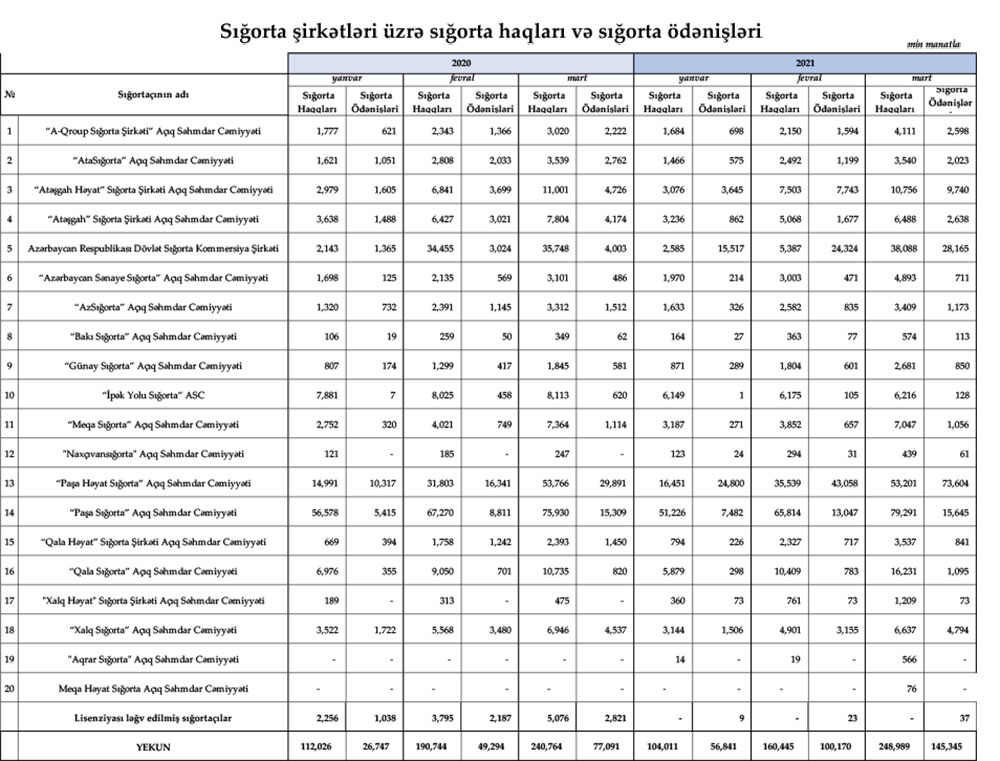 2021-ci ilin yanvar-mart dövründə Azərbaycanın 20 sığorta şirkəti tərəfindən 248 milyon 989 min manat sığorta haqları hesablanıb, 145 milyon 345 min manat sığorta ödənişləri həyata keçirilib.