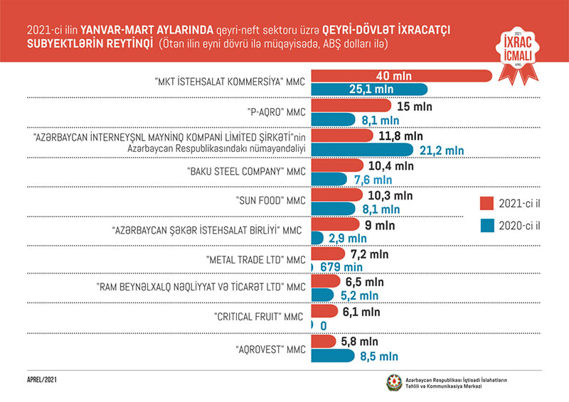 Marja xəbər verir ki, 2021-ci ilin yanvar-mart ayları üzrə hazırlanan qeyri-dövlət ixracatçı subyektlərin reytinqində ilk onluqda aşağıdakı şirkətlər təmsil olunurlar: